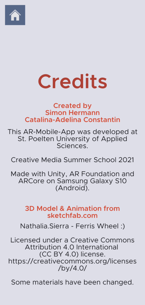 The player is asked for permission to use the camera when the app is started. After the player has agreed, the main menu opens where buttons can be used to start and end the game. The idea of the symbolic Upload-Button is that students can later upload a photo of their drawings. These could be projected as a collage on a wall of the room. An area with the credits of the game can also be viewed.